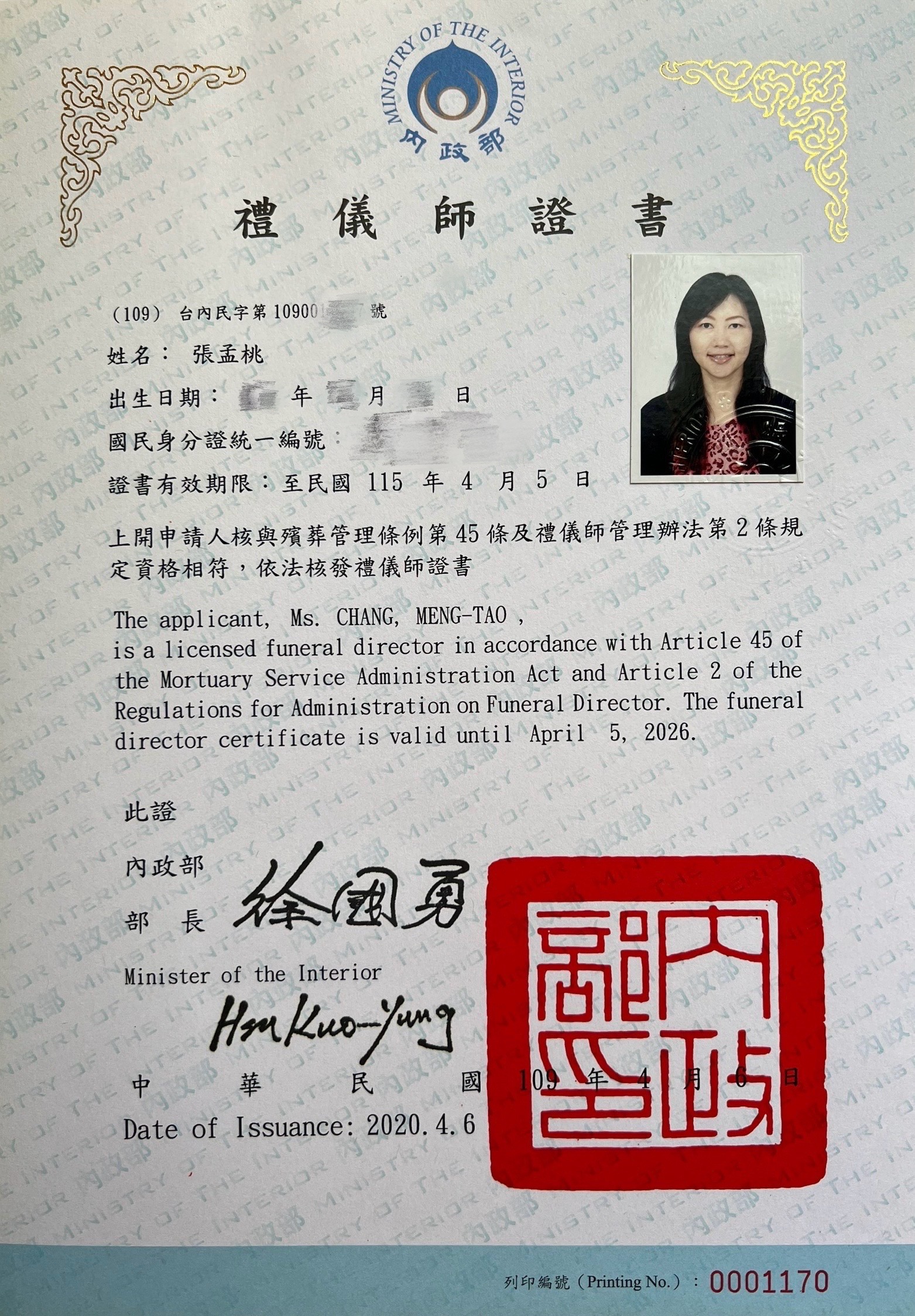 ![]() 張文玉 | 專任講師 兼遺體處理中心主任 | 玄奘大學 宗教學研究所 碩士 | 殯葬生死觀、宗教科儀、臨終關懷、殯葬學、宗教生死觀 | 電子郵件:p01745@gm.jente.edu.tw 分機:65031 |